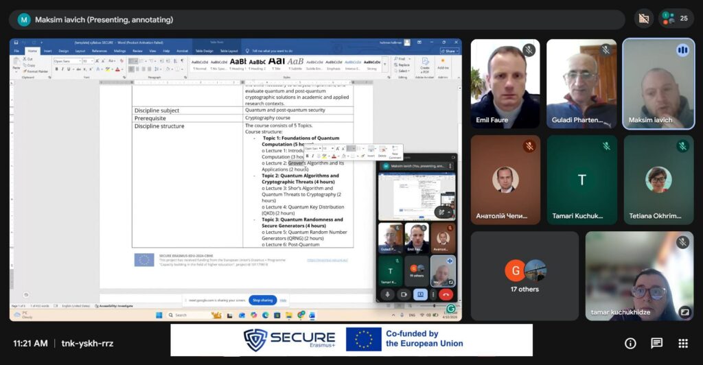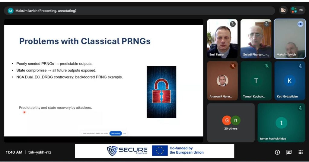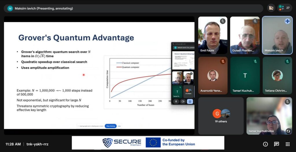 Член-кореспондент Національної академії наук Грузії, професор Максим Явич, успішно провів дводенний тренінг для членів проєкту Erasmus+ SECURE. Тренінг був присвячений квантовій та постквантовій безпеці та охоплював такі ключові теми, як нові криптографічні виклики, перспективні підходи до безпеки, а також розробка сучасних навчальних матеріалів і силлабусів у цій сфері, що стрімко розвивається. Під час тренінгу професор Явич також провів демонстрацію першої в Грузії лабораторії квантової безпеки, створеної в межах проєкту SECURE на базі Кавказького університету. Сесії надали учасникам як теоретичні знання, так і практичні перспективи, сприяючи дискусіям щодо інтеграції тем квантової безпеки в академічні навчальні програми.